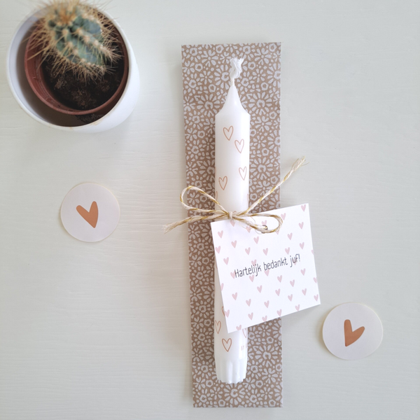 Aan de kaars zit een kadokaartje met de tekst 'Hartstikke bedankt juf!' of 'Hartelijk bedankt juf!'